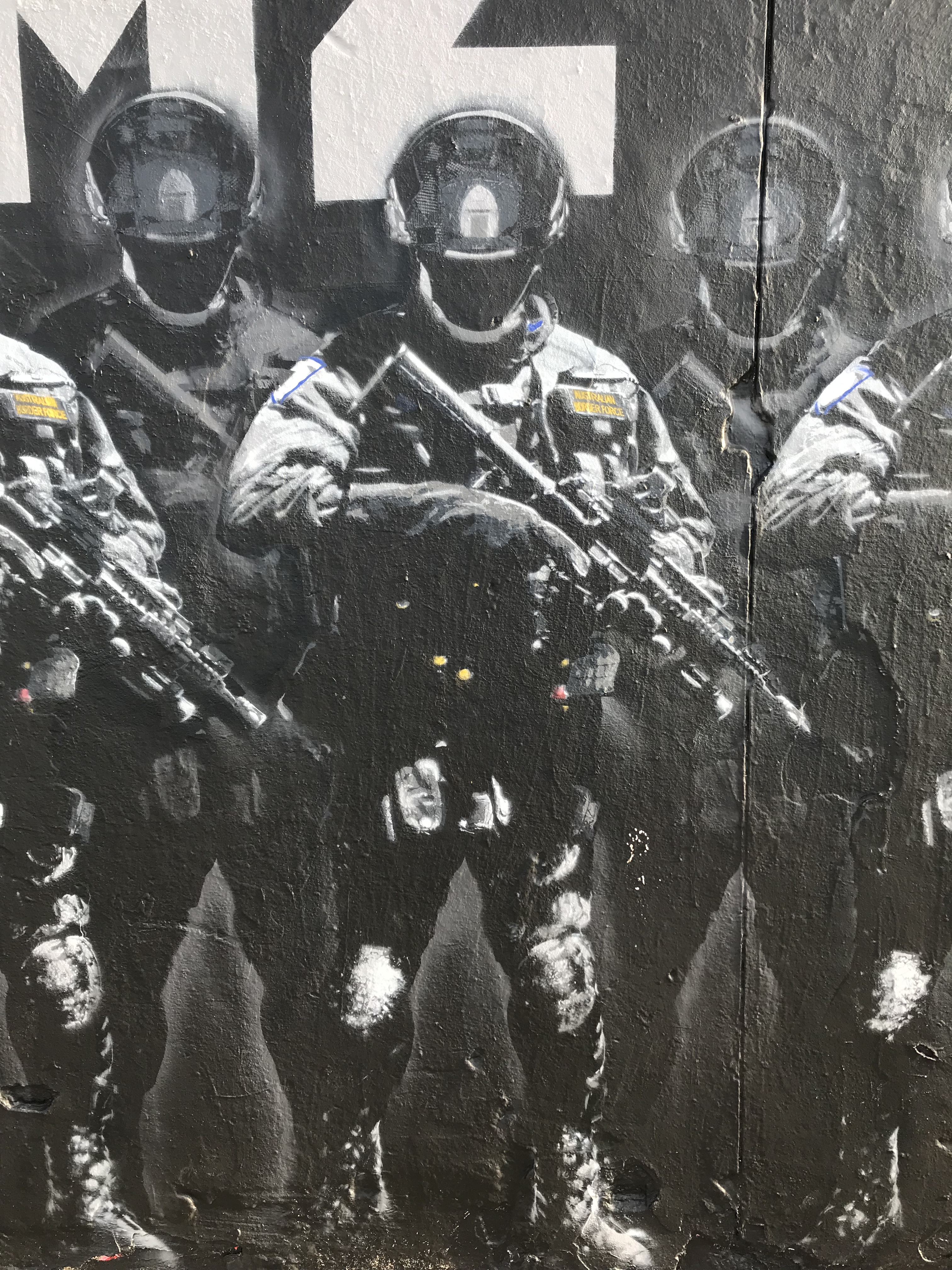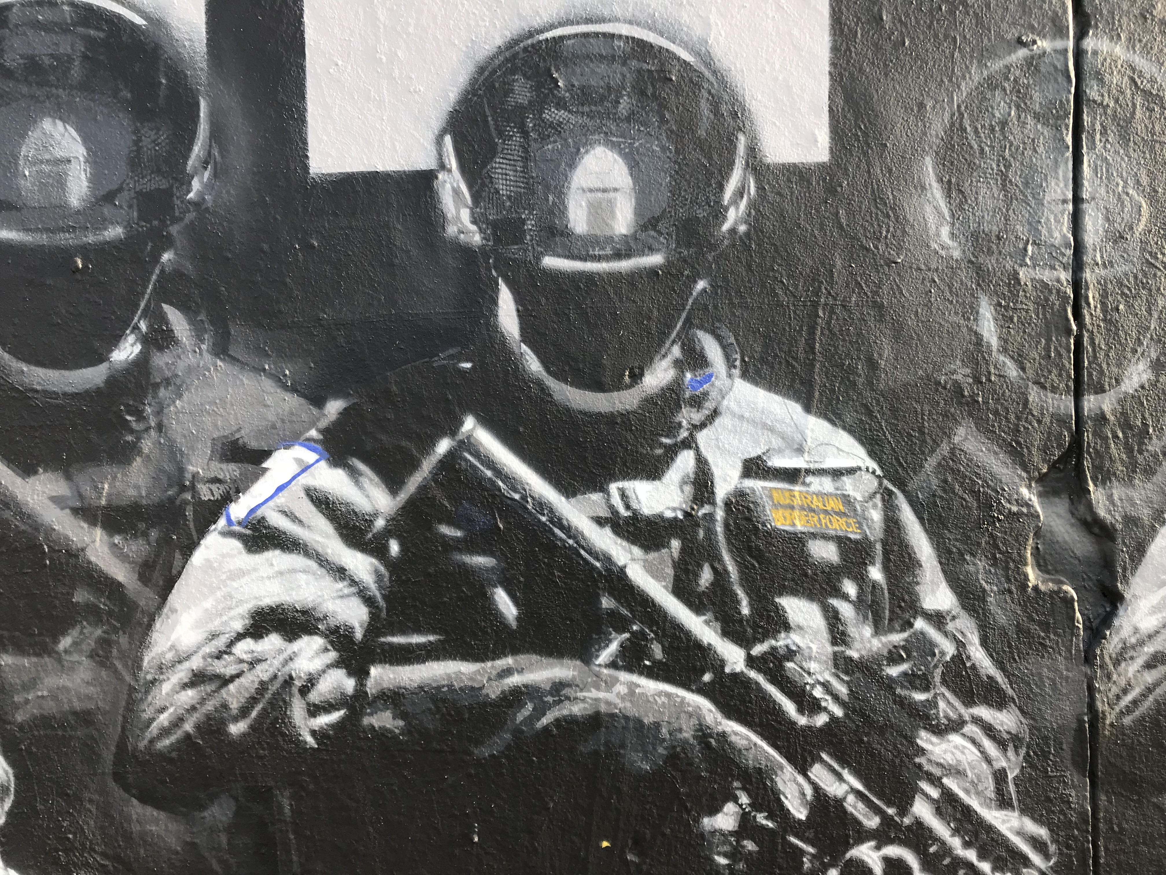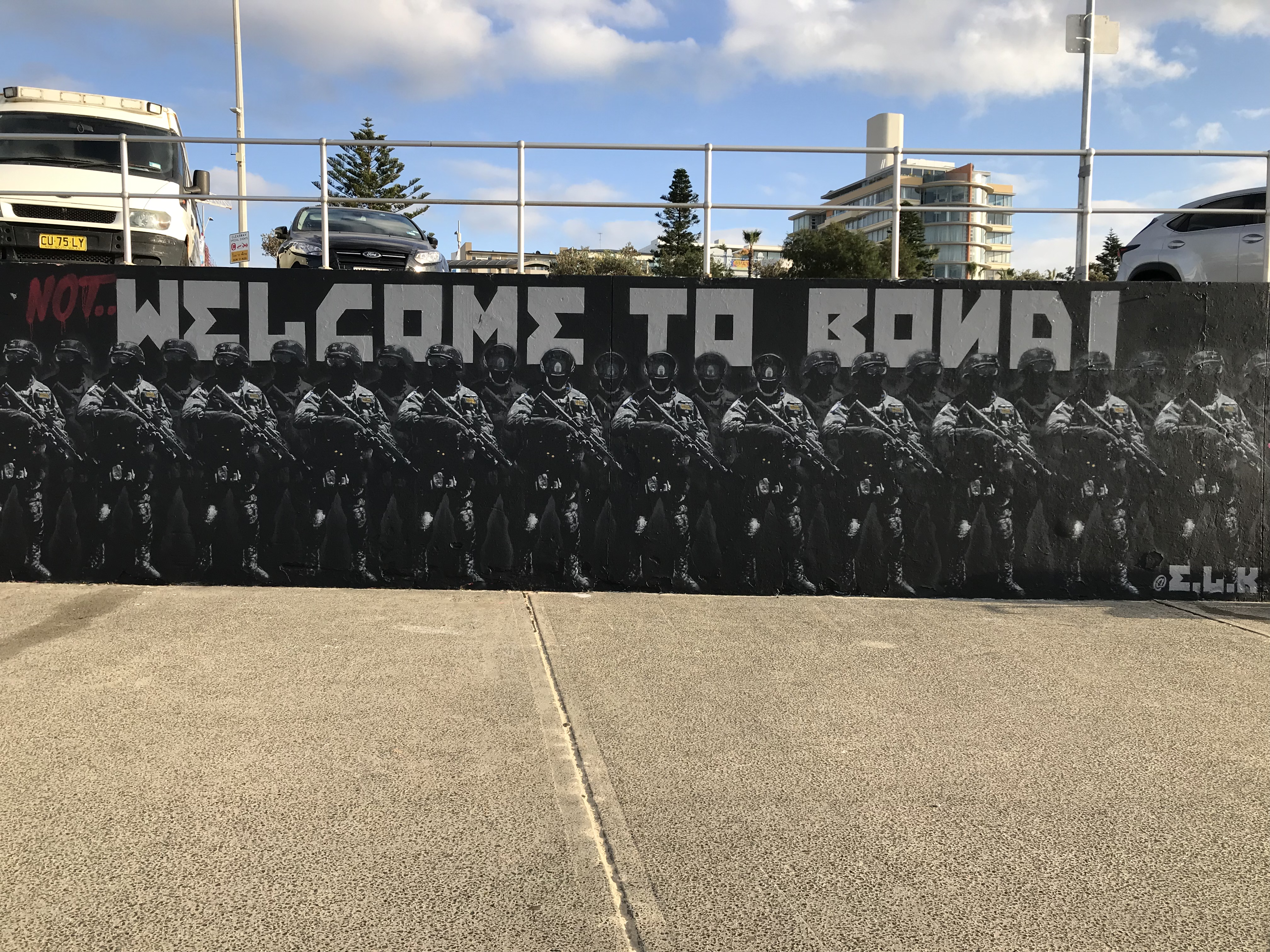 The panel depicts 24 Border Force ‘soldiers’ in paramilitary/riot gear holding semiautomatic weapons – with WELCOME TO BONDI lettered in a Soviet-style font across the top.